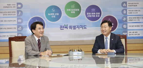 전북자치도에 따르면 김관영 전북지사와 김진태 강원지사는 11일 전북자치도청 회의실에서 ‘상생협력 협약식’을 갖고 ‘특별자치도 성공 실현을 위한 자치분권 확보’ 등을 주요 내용으로 공동 합의문을 채택했다.