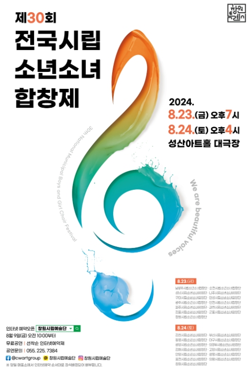 창원에서는 2011년 제19회 전국시립소년소녀합창제를 개최한 이후 13년 만에 개최되며 ‘We are beautiful voices’라는 주제로 미래의 주인공인 아이들의 예쁜 목소리와 깜찍한 율동으로 생기발랄한 무대를 선보일 예정이다.