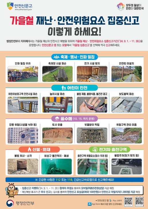 이번 집중 신고 기간은 가을철에 자주 발생하는 재난ㆍ안전사고를 예방하기 위해 운영한다.