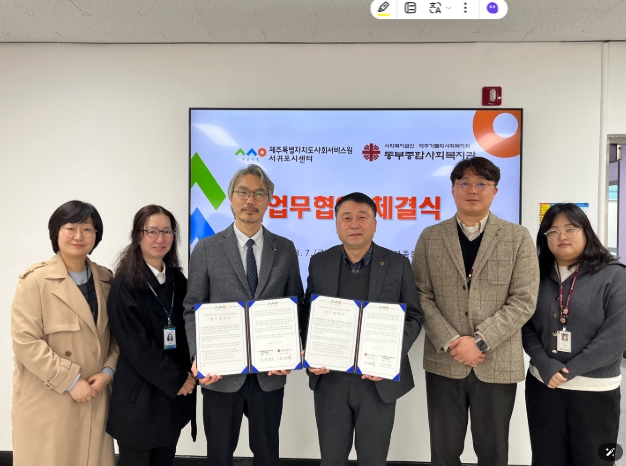 [뉴스서울] 제주특별자치도사회서비스원 서귀포시센터(센터장 송장희)와 서귀포시 동부종합사회복지관(관장 오명복)은 7일 서귀포시 지역소멸 예방과 저출산 ․ 고령사회 대응을 위한 업무협약 체결했다.