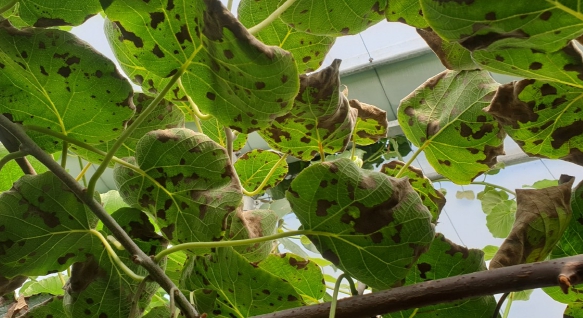 키위 점무늬병 방제를 위해서는 시설 내 공기 순환과 습도 관리, 병 발생 초기 전용 약제 살포가 중요하다.