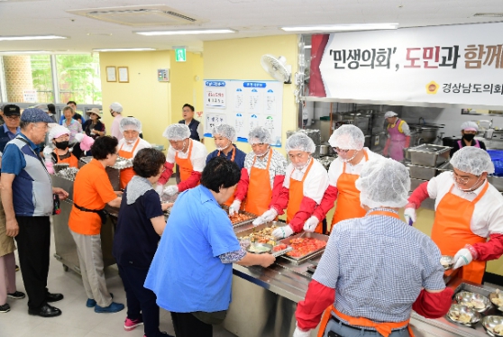 [뉴스서울] 경상남도의회 의장단 일행이 7월 25일, 창원시 의창노인종합복지관에서 관내 어르신들의 민생현장 목소리를 청취한 후 무료급식 봉사활동에 참여했다.