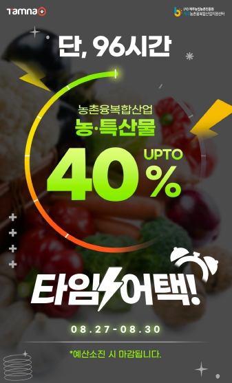 [뉴스서울] 제주농촌융복합산업지원센터와 제주특별자치도관광협회에서 운영하는 제주여행 공공플랫폼 탐나오 가 탐나오 사이트 內‘제주 농부의 장’카테고리 농·축·특산물을 8월 27일부터 8월 30일까지 단 96시간 동안 최대 40% 할인하는 “제주농촌융복합산업 농특산물 타임어택 프로모션”을 진행한다. (예산소진시 마감)