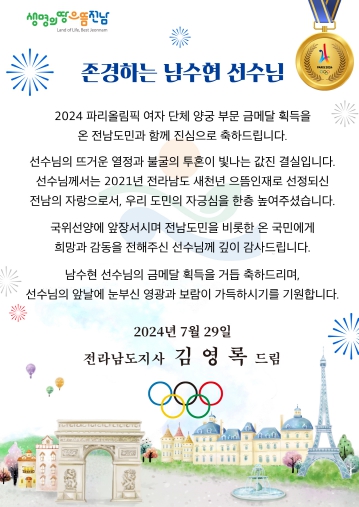 [뉴스서울] 김영록 전라남도지사는 2024 파리올림픽에서 여자 단체전 10연패의 신화를 달성한 전남 출신 남수현 선수에게 29일 축전을 보냈다.