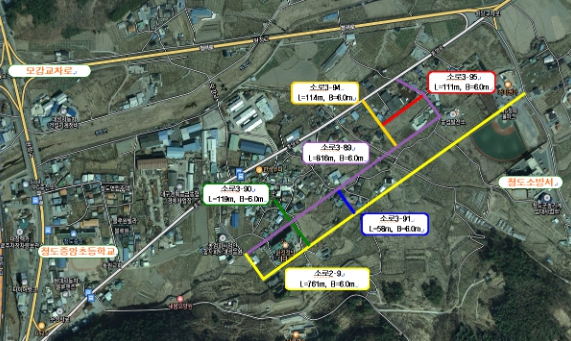 올해 청도읍 원정리 일원 6개 노선(소로2-9, 소로3-89, 소로3-90, 소로3-91, 소로3-94, 소로3-95) 도시계획도로 개설에 22억 원을 투입하고 있으며, 보상 및 사업 추진 상황에 맞추어 예산을 적기에 투입할 예정이다.