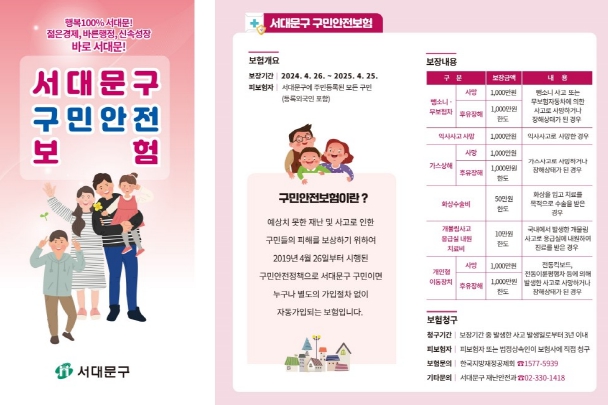 서대문구 구민안전보험에 대한 자세한 내용은 서대문구청 재난안전과로 문의하면 된다.