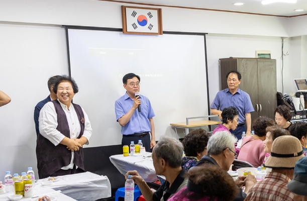 ▲ 진교훈 서울 강서구청장(정면 가운데)이 초복을 맞아 양천향교에서 열린 ‘삼계탕 나눔 행사’에서 어르신들께 인사하고 있다. |