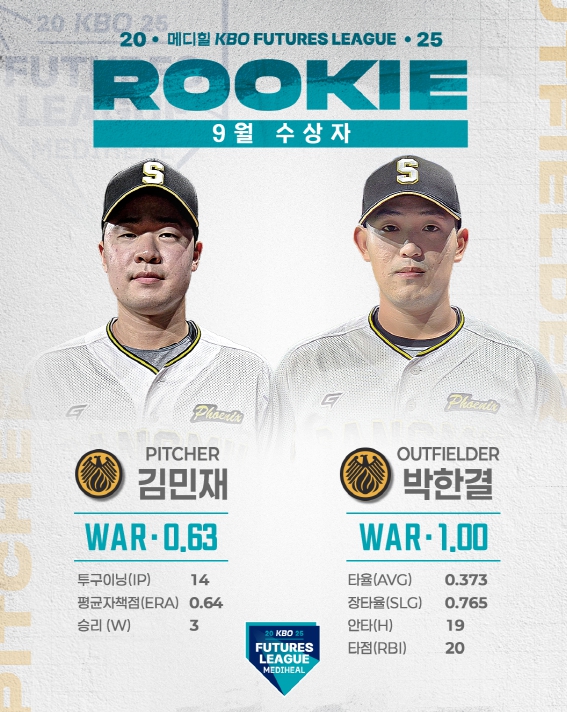 [뉴스서울] 2025 메디힐 KBO 퓨처스리그의 9월 퓨처스 루키상 수상자로 투수 부문에는 상무 김민재가 WAR 0.63, 타자 부문에는 상무 박한결이 WAR 1.00을 기록하며 각각 선정됐다.