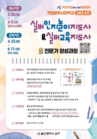 ▲ 남구 여성내일이음센터, 직업훈련사관학교 교육생 모집(실버인지놀이지도사 전문가 양성과정)