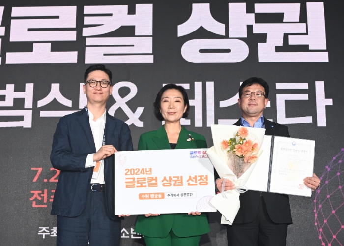 [뉴스서울] 중소벤처기업부 주관 ‘2024년 글로컬 상권 창출팀’ 공모에 선정된 수원시가 24일 전주 문화공판장 작당에서 열린 ‘글로컬 상권 출범식’에서 글로컬 상권 창출팀 선정서를 받았다.