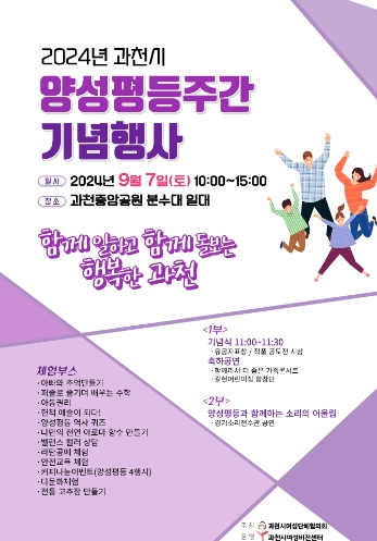 [뉴스서울] 과천시는 양성평등주간(9.1~9.7)을 맞아 오는 7일, 중앙공원 분수대 일원에서 ‘함께 일하고 함께 돌보는 행복한 과천’이라는 슬로건으로 양성평등주간 기념행사를 연다.