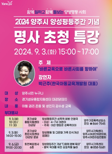 [뉴스서울] 양주시는 양성평등주간을 맞아 오는 9월 3일 경기섬유종합지원센터 대강당에서 명사 특강을 진행한다고 26일 밝혔다.
