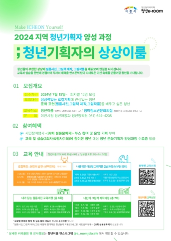 청년일자리카페 ‘청년e-room(경충대로 2701-32)’은 앞서 두 번의 문화기획자 양성 과정을 실시했고, 교육을 수료한 청년들이 직접 기획한 ‘웃짜 이천 긍정페스티벌’, ‘고(GO)마음 행사’를 추진한 바 있다.