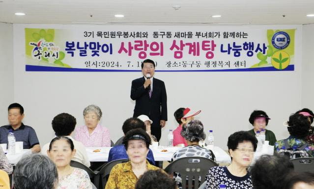 [뉴스서울] 구리시 동구동 행정복지센터는 7월 13일 행정복지센터 생활체육실에서 제3기 목민원우봉사회 주관으로 지역 어르신 250여 명을 모시고 ‘사랑의 삼계탕 나눔 행사’를 개최했다.