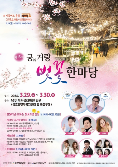 [뉴스서울] 울산의 대표적인 벚꽃 축제인 '제13회 궁거랑 벚꽃 한마당' 축제가 오는 29일부터 30일까지 남구 무거천 일원에서 개최된다.