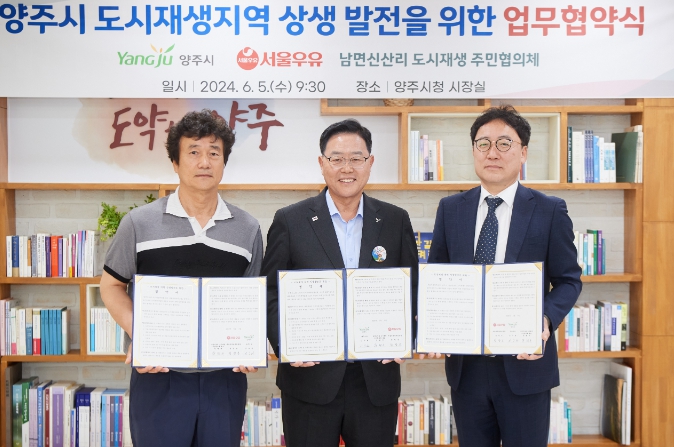 ▲ 지난 6월 양주시-서울우유-남면 신산리 도시재생 주민협의체 업무협약식 |
