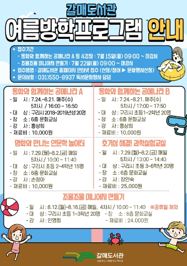 [뉴스서울] 구리시 갈매도서관은 여름방학을 맞이한 어린이들이 유쾌하고 뜻깊은 시간을 보낼 수 있도록 오는 7월 24일부터 8월 21일까지 다채로운 여름방학 프로그램을 운영한다.