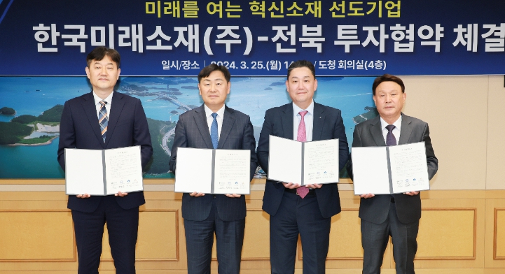 전북특별자치도는 25일 전북자치도청에서 김관영 도지사, 강임준 군산시장, 박종배 한국산업단지공단 전북본부장, 이상호 한국미래소재㈜ 대표 등이 참석한 가운데 올해 안에 360억을 투자하고 47명을 직접 고용해 이차전지용 동박 소재 및 재생 구리 등을 생산하는 공장신설을 위한 투자협약을 체결했다.
