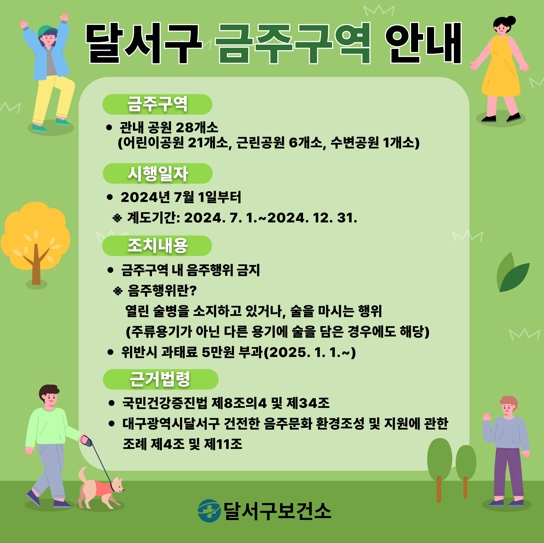 달서구는 2024년 5월 13일'대구광역시달서구 건전한 음주문화 환경조성 및 지원에 관한 조례'를 일부 개정해 금주구역 지정에 관한 근거를 마련했다. 달서구보건소는 행정예고를 통한 주민 의견 수렴을 거쳐 어린이공원 21개소, 근린공원 6개소, 수변공원 1개소 등 모두 28개소를 ‘금주구역’으로 지정했다.
