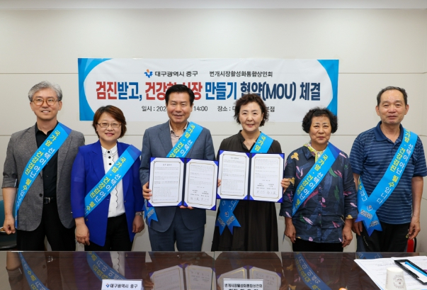 [뉴스서울] 대구 중구는 8일 번개시장(태평로 177-1)에서 번개시장 활성화통합상인회(회장 화은경)와 검진받고 건강한 시장 만들기 업무협약(MOU)을 체결했다.