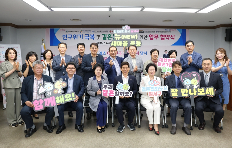 [뉴스서울] 대구 달서구가 지난 5일 구청 회의실에서 한국산업단지공단 대구지역본부 등 경제관련 2개 기관 4개 단체와 저출생 인구 위기에 공동으로 대응하고자 결혼(출산)문화 확산을 위한 업무 협약을 체결했다.