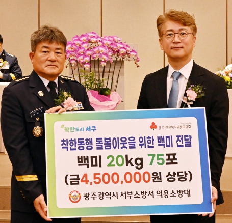 [뉴스서울] 김이강 서구청장은 24일 오전 광주 서부소방서 의용소방대으로부터 관내 돌봄이웃들을 위한 백미20㎏ 75포(450만원 상당)을 전달받고 감사의 마음을 전했다.
