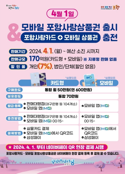 4월 개인 구매한도액은 포항사랑카드와 모바일 포항사랑상품권 통합 50만 원, 보유 한도는 통합 70만 원이고 지류형 상품권은 판매하지 않는다.