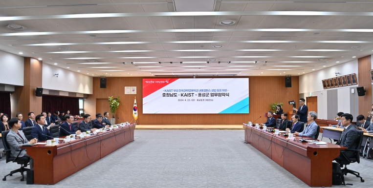 김태흠 지사는 23일 도청 대회의실에서 이광형 KAIST 총장, 이용록 홍성군수와 ‘한국과학영재학교 내포캠퍼스 설립 등을 위한 업무협약’을 체결했다.