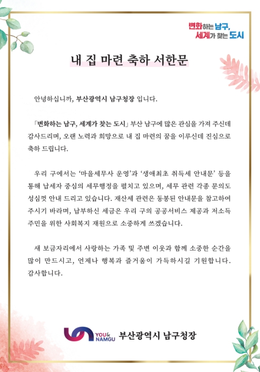 [뉴스서울] 부산 남구는 생애 최초로 주택을 취득한 납세자 473명에게 주택 마련의 기쁨을 함께 나누는 ‘내 집 마련 축하 서한문’ 및 ‘재산세 안내문’을 7월 24일 발송한다고 밝혔다.