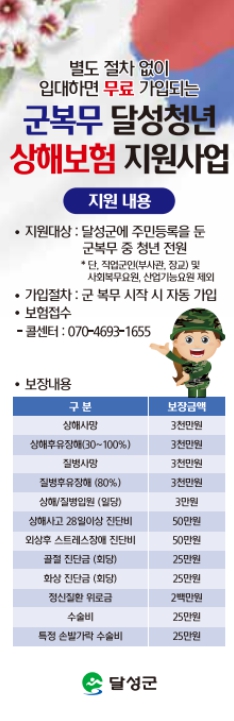 보험료 전액은 달성군이 부담하며, 가입된 현역병들은 군 생활 중 사고로 상해를 당할 시 최대 3천만 원까지 보험금을 지원받을 수 있다.