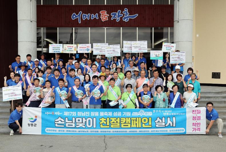 [뉴스서울] 장흥군은 23일 장흥읍 중앙로 및 토요시장 상가를 대상으로 ‘물축제 성공 기원 손님맞이 친절 캠페인’ 을 전개했다.