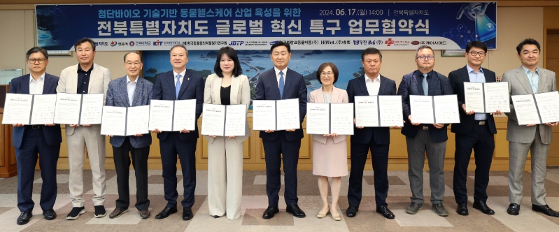 이에 전북자치도는 17일 도청 회의실에서 전북자치도와 정읍시, 전북대학교, 안전성평가연구소, (재)한국동물의약품평가연구원, 전북테크노파크, 한국엘랑코동물약품(주), ㈜휴벳, 우진비앤지(주), 한국썸벧(주), ㈜케어사이드와 글로벌 혁신특구 공모 대응을 위한 동물헬스케어 산업 육성 업무협약을 체결했다.