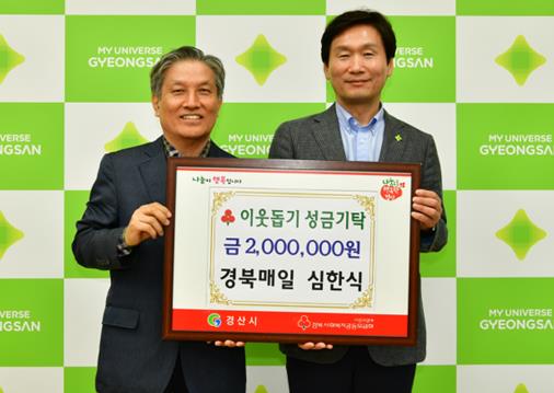 [뉴스서울] 심한식 경북매일신문 기자가 13일 경산시청을 방문해 작년에 이어 이웃돕기 성금 200만원을 기탁하며 훈훈함을 안겼다.