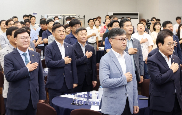 ▲ 23일 전주시 아름다운컨벤션웨딩장에서 열린 한국노총 전북본부 제64년차 정기대의원대회에 김관영 전북특별자치도지사, 권기봉 한국노총 전북본부의장, 이원택 더불어민주당 전북특별자치도당위원장, 전북특별자치도의회 문승우 의장, 서거석 전북특별자치도교육감 등이 참석한 가운데 국민의례를 하고 있다. |