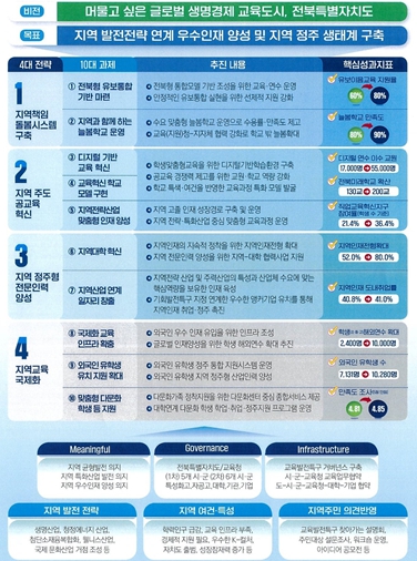 전북자치도와 교육청이 공동으로 제출한 교육발전특구 사업에는 ▲지역 책임 돌봄 시스템구축 ▲지역주도 공교육혁신 ▲지역 정주형 전문인력 양성 ▲지역 교육 국제화 4대 추진전략을 목표로 10대 세부과제가 담겨있다.