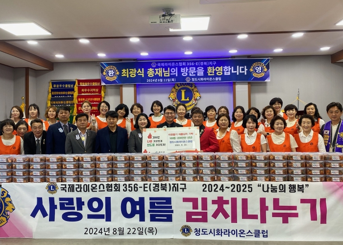 청도시화라이온스클럽 정지은 회장은 “이번 여름김치 나눔을 통해 관내 어려운 이웃들이 조금이나마 여름 막바지 무더위를 시원하게 보내시는 데 도움이 되기를 바라며, 앞으로도 지속적인 이웃사랑 실천 봉사를 통해 지역사회 발전에 적극 앞장서겠다.”라고 말했다.