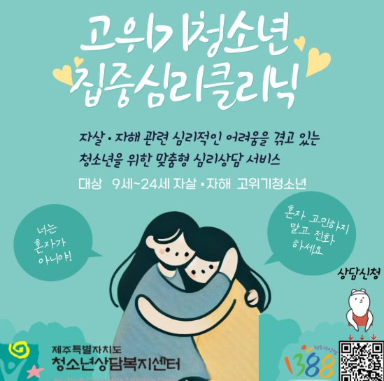 [뉴스서울] 제주특별자치도청소년상담복지센터는 자살·자해 문제를 가지고 있는제주 청소년들의 심리적 안정을 도모하기 위하여 ‘2025년 고위기청소년 집중 심리클리닉’을 운영한다고 밝혔다.