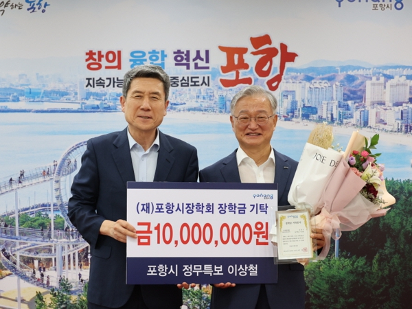 [뉴스서울] 이상철 포항시 정무특보가 퇴임을 앞두고 22일 인재 육성 장학금 1,000만 원을 포항시 장학회에 기탁하며 지역사회에 훈훈한 미담이 되고 있다.