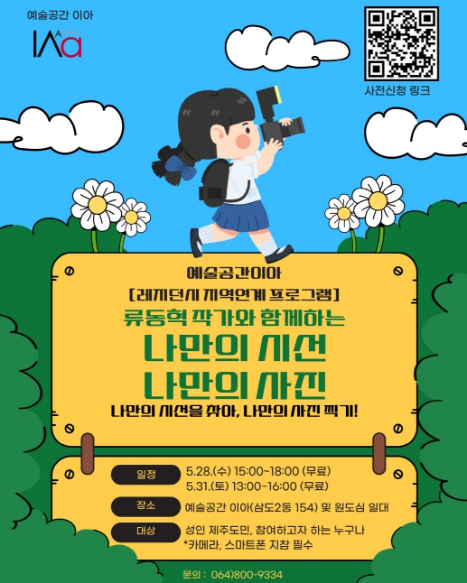 아트 클래스 '나만의 시선 나만의 사진'은, 총 2회에 걸쳐 각 3시간 동안 예술공간 이아를 비롯 제주시 원도심 일대에서 ▲작가의 노하우를 공유하는 강연, ▲사진 촬영 체험, ▲작가의 피드백으로 진행된다.
