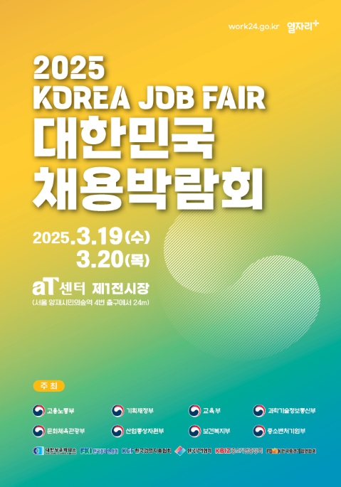[뉴스서울] 정부(고용노동부ㆍ기획재정부ㆍ교육부ㆍ과학기술정보통신부ㆍ문화체육관광부ㆍ산업통상자원부ㆍ보건복지부ㆍ중소벤처기업부)는 3월 19일부터 3월 20일까지 이틀간 aT센터 제1전시장(서울 서초구 강남대로 27)에서 「2025 대한민국 채용박람회」를 개최한다.