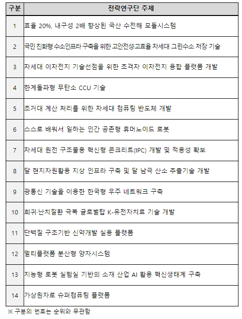 지난 3.19.(화)~3.20.(수) 이틀간 이루어진 제안서 평가에서는, 1.31.(수) 공고 이후 접수된 51개 제안서에 대한 검토가 이루어졌다. 평가위원으로는 국가과학기술자문회의 위원, 기업 CTO, 논문 고피인용 연구자(HCR), 리더연구자 등 산·학·연 최고의 전문가 45인이 참여했으며, 제안 연구 주제에 대한 국가적 필요성·탁월성, 성과에 대한 국민적 체감 가능성, 수행 체계의 혁신성 등을 종합적으로 검토했다. 이를 통해 수소, 이차전지, 반도체, 우주·항공, 양자, AI, 첨단바이오 등 과학기술 전 분야를 아울러, 국가적 역량을 결집해 연구개발을 추진할 필요가 있는 14개의 후보 주제를 선정했다.