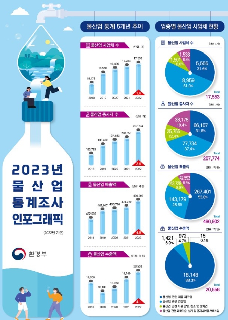 [뉴스서울] 환경부는 2022년 기준 물산업 전반에 대한 현황과 실태를 담은 ‘2023 물산업 통계조사’ 결과를 공개했다. 물산업 통계조사는 물산업 분야 주요 정책수립의 기초자료로 활용하기 위한 국가승인통계다.