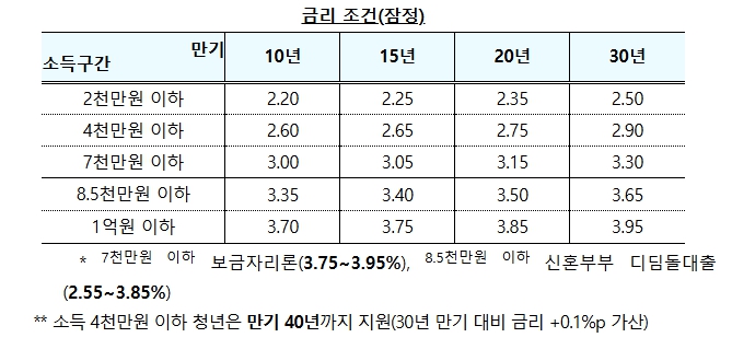 아울러 생애최초 구입 등 약 10여종의 다양한 우대금리를 통해 최저 1%p대까지 금리가 낮아져 시중금리와 차이가 커진 점을 고려하여, 우대금리에는 적용 상한(0.5%p)과 적용 기한(자금별 4~5년)을 설정한다.