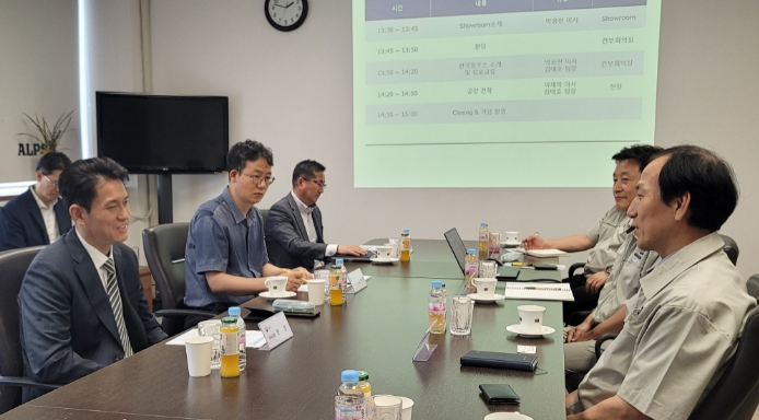 ▲ 6월 12일(수) 광주광역시 한국알프스(주) 회의실에서 관계자들의 의견을 듣고 있는 한민 심사국장(좌측1번째) |