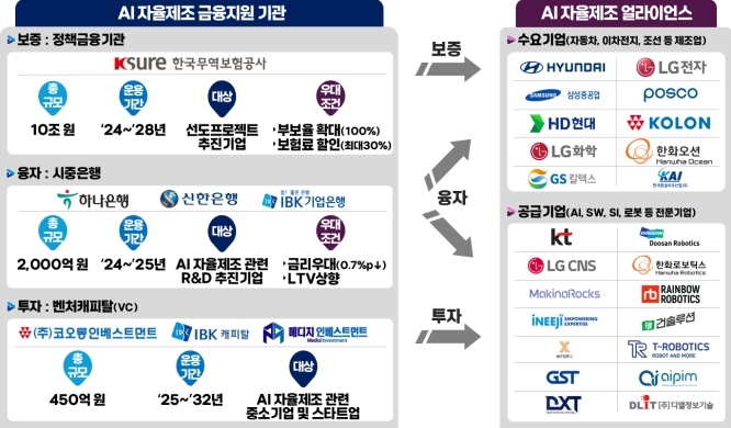 신한, 기업, 하나 등 3개 시중은행은 AI 자율제조 기술을 보유한 기업들을 위해 0.7%p 우대금리를 적용한 2,000억원 규모의 대출 프로그램을 지원한다. 이 프로그램은 AI 자율제조 관련 연구개발(R·D)을 추진하거나 AI 자율제조를 생산현장에 적용하는 기업들에 제공될 예정으로 산업통상자원부가 지원대상 기업들을 추천하게 된다.