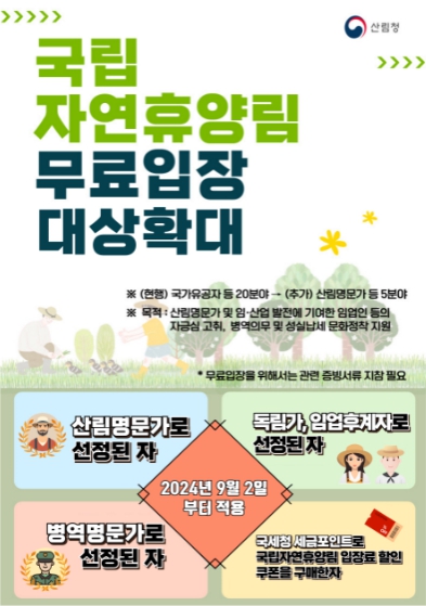 임상섭 산림청장은 “더 많은 국민들께서 우리 숲에서 산림휴양시설을 이용하고 즐기실 수 있도록 입장료 면제 대상을 확대했다”라며 “정부 부처 간 협업을 통해 더욱 다양하고 유익한 혜택을 제공해 나가겠다”고 말했다.