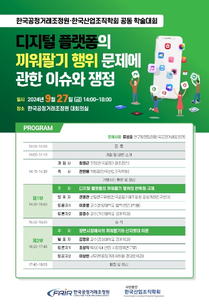 [뉴스서울] 한국공정거래조정원은 한국산업조직학회와 함께 ‘디지털 플랫폼의 끼워팔기 행위 문제에 관한 이슈와 쟁점’을 주제로 공동 학술대회를 개최했다.