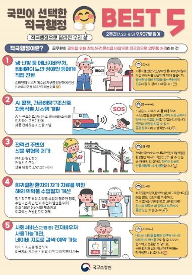 온라인 국민투표 결과 (1위)에너지바우처, 집배원이 노인·장애인 등에게 직접 전달, (2위)AI 활용 긴급해양구조신호 자동식별 시스템 개발, (3위)전력선 주변의 산불 위험목 제거 등이 ‘국민이 뽑은 적극행정 우수사례 BEST 5’로 최종 선정됐다.