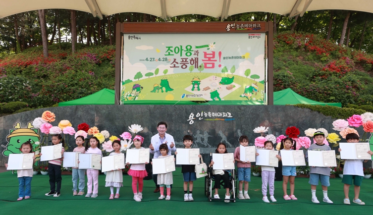 | ▲ 이상일 용인특례시장이 27일 용인농촌테마파크에서 열린 축제에서 사생대회 수상자 17명의 어린이와 기념촬영을 하고 있다. |