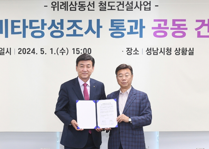 [뉴스서울] 성남시는 1일 경기 광주시와 함께 위례삼동선 건설사업의 예비타당성조사 통과를 위한 공동건의문 서명식을 개최했다.